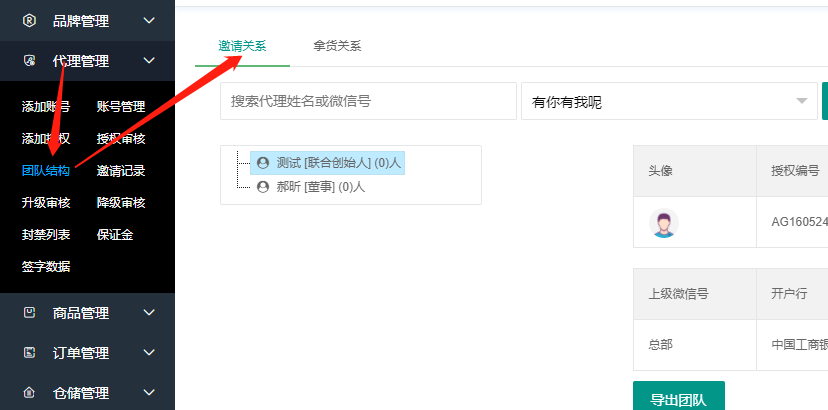 点击代理管理→团队结构,即可查看。