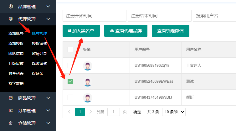 对于有些违规会员,采取禁用或者删除,让该会员无法登陆系统。点击代理管理、账号管理,选中需要禁用的代理,点击加入黑名单即可。