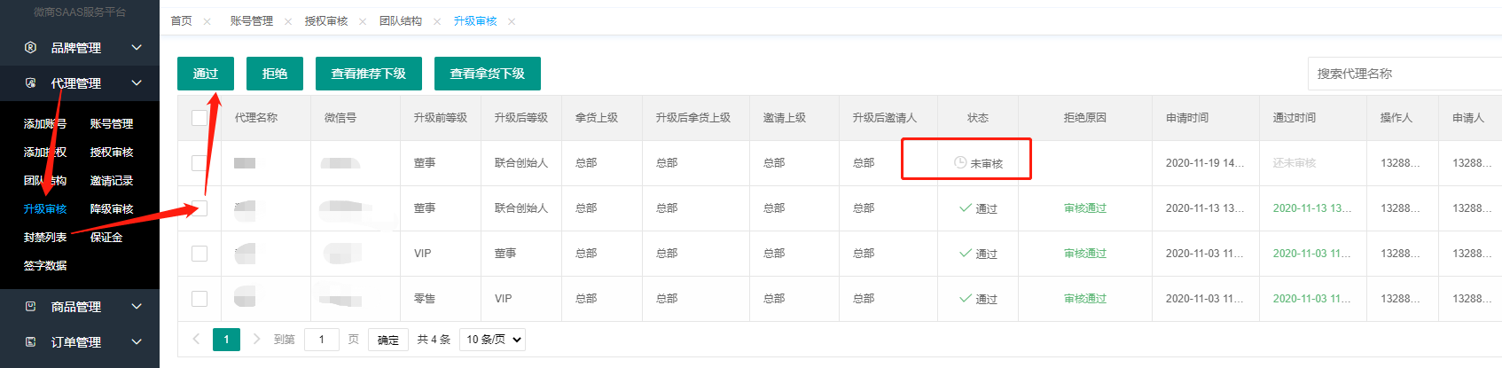 登陆后台,点击代理管理→升级审核,可以看到代理的升级记录。