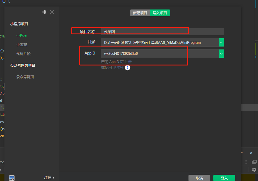 - 修改小程序名字、小程序APPid,然后点击导入按钮,完成小程序导入。
