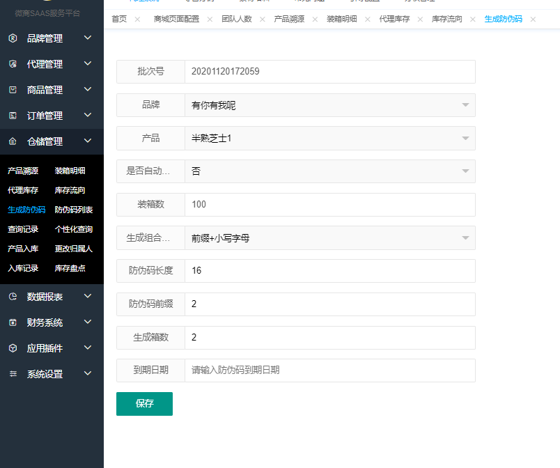 点击【生成防伪码】,按要求设置后,生成品牌防伪码