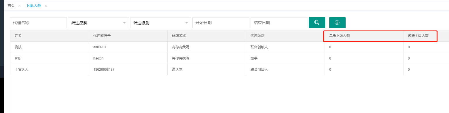 点击【团队人数】,查看拿货下级人数及邀请下级人数。
