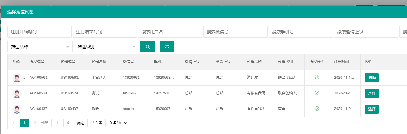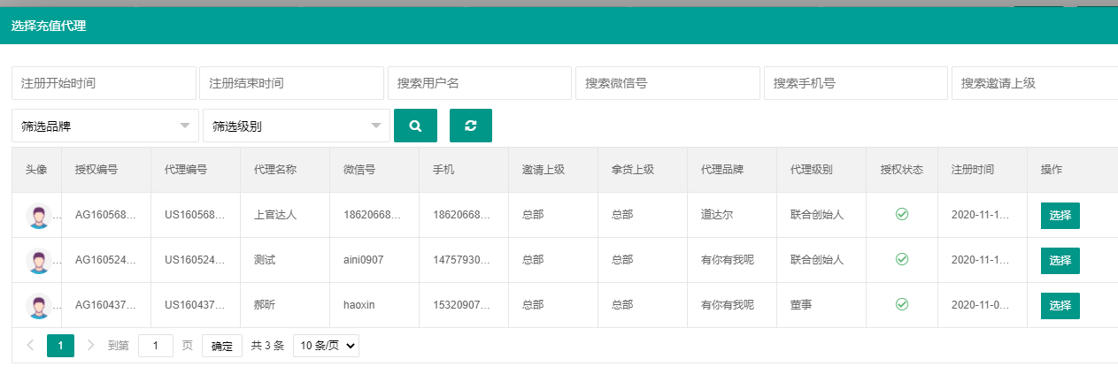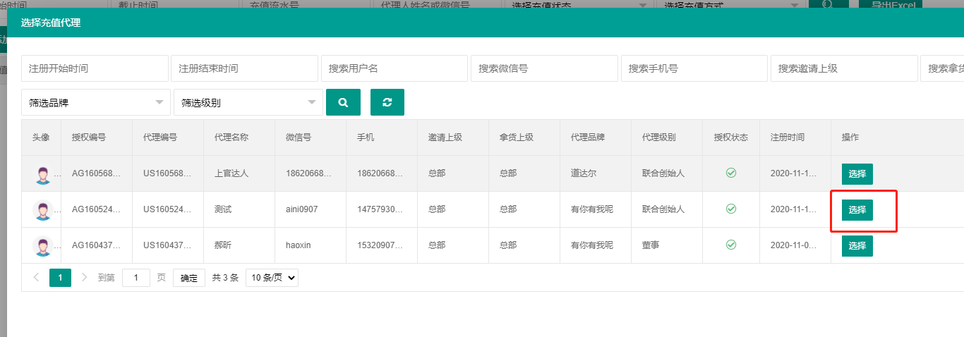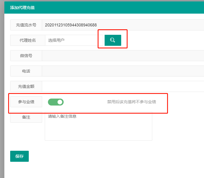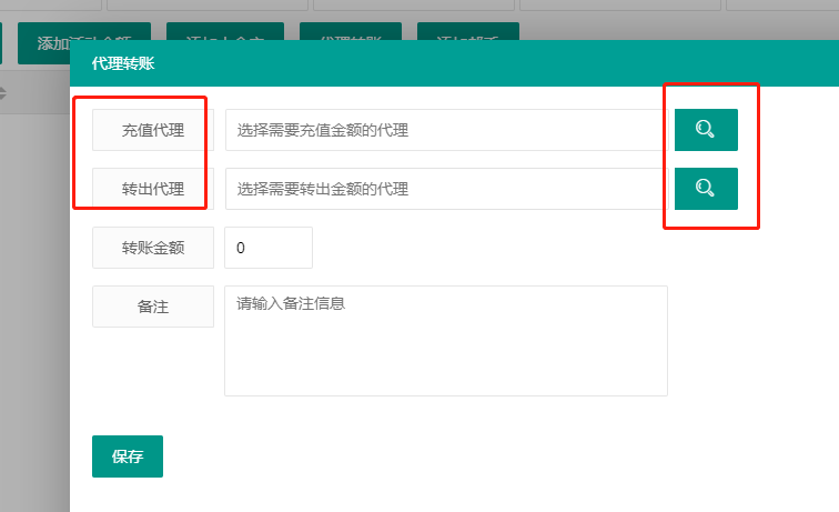 点击【代理充值】,可以为代理充值各种类别的余额。